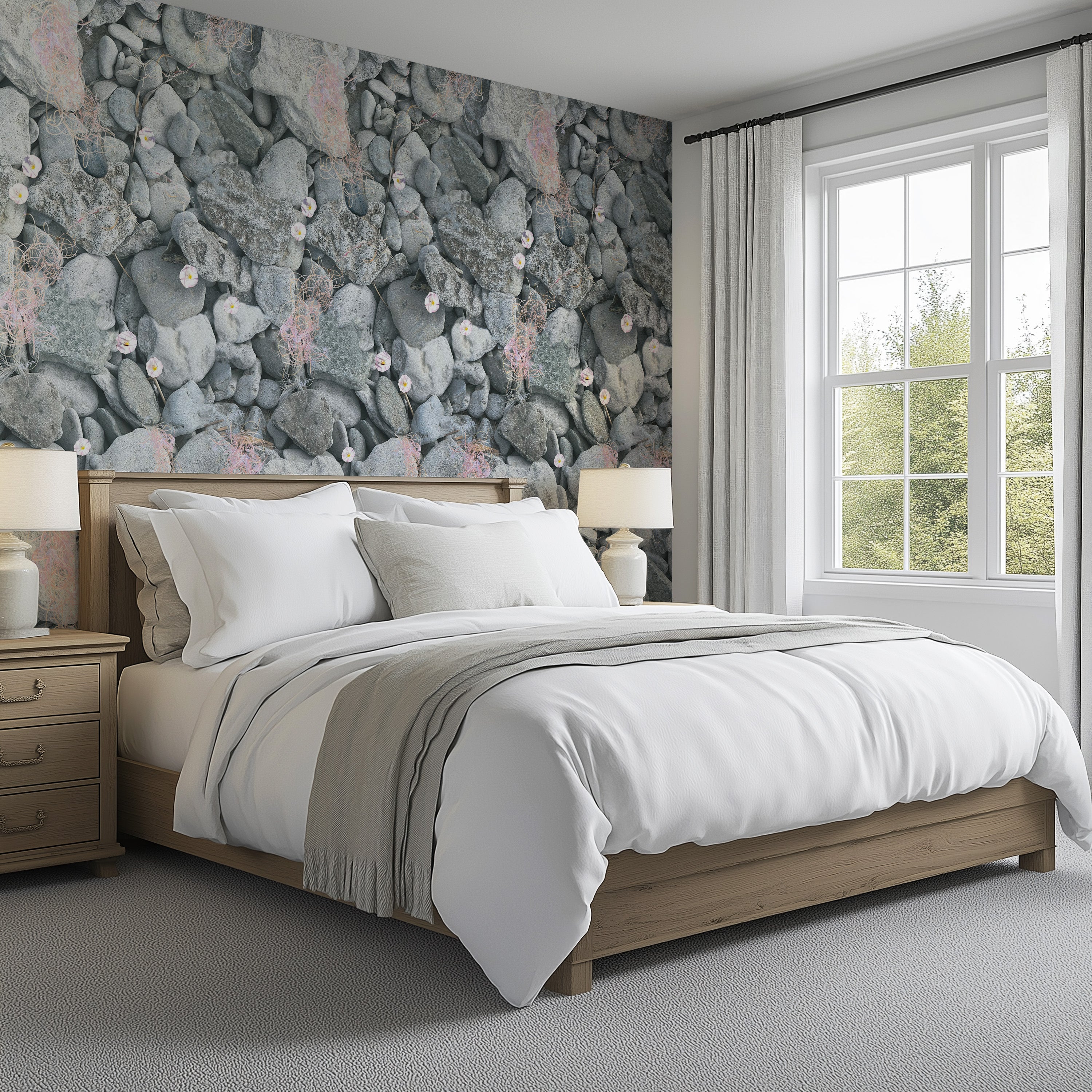 Stenarna i bakgrunden bär på en stillsam styrka – trygga, jordande och tidlösa. Ovanpå dem får det rosa livets rörelse ta plats, med blommor och slingrande inspirerade former.